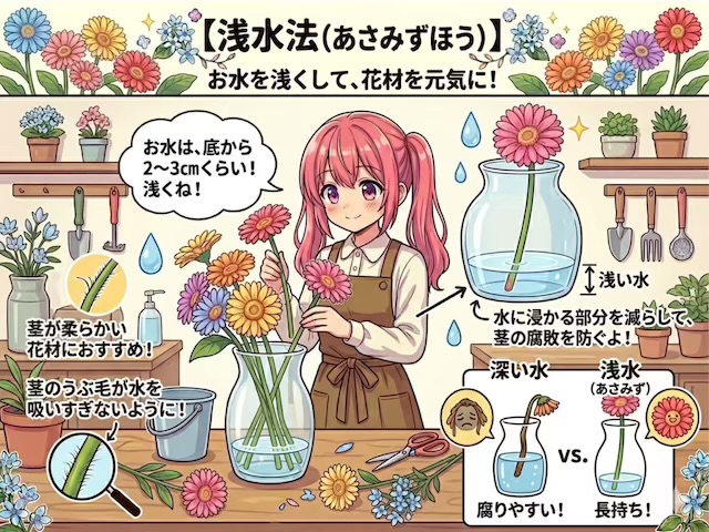 浅水法とは、花瓶などの花器に入れる水の量を少なくして、浅い水で花を生ける方法です。一般的に、茎が柔らかく水に浸かると腐敗しやすい植物において、水に浸かる面積を減らして腐敗リスクを下げるために行われます。