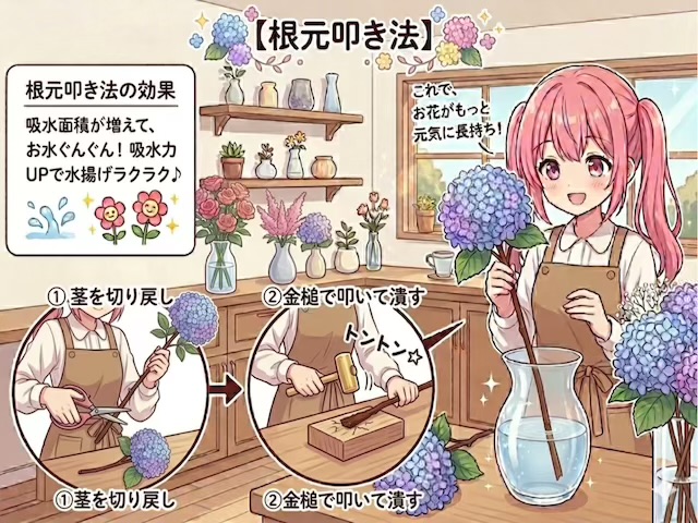 根元割り法・根元叩き法とは、硬い茎や枝の根元に縦にハサミを入れて割る、または金槌などで硬い茎や枝の根元を叩いて潰す水揚げ方法です。