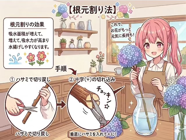 根元割り・根元叩きを行う事で、吸水する場所の面積が増えて、吸水力が高まり水揚げしやすくなります。