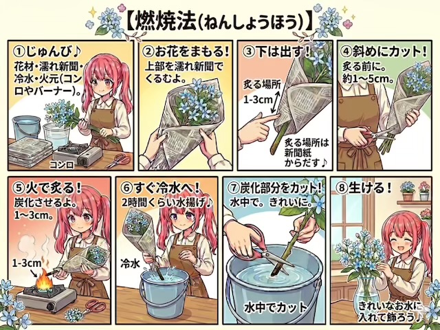 燃焼法とは、切り花の切り口の先端を火で炙り炭化させた後に、冷水に漬けて、吸水を改善する水揚げ方法です。一般的に水切りなどをしても、水揚げが上手くいかない場合等に行われます。
