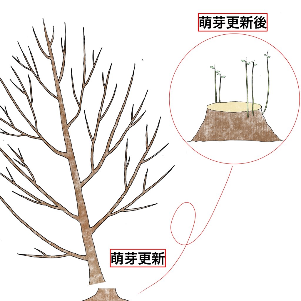 - 萌芽更新をする時は、幹の直径が12cmを超えている必要があります。