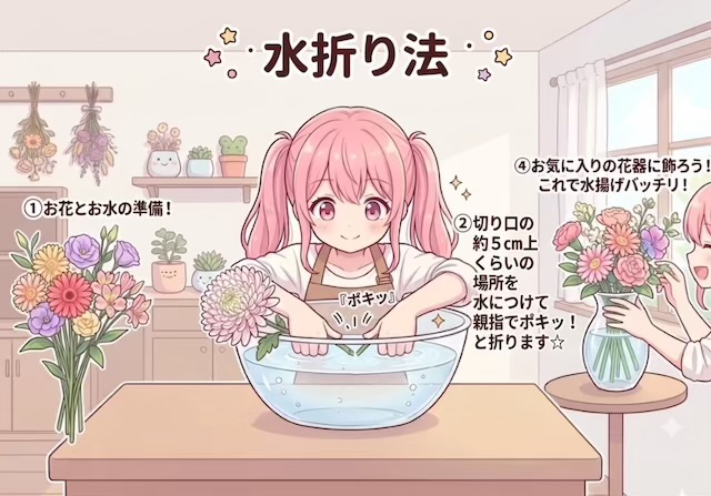 - 冷水に浸ける:お湯から切り花を出した後、そのまま冷水の中に2時間程度浸けて水揚げします。