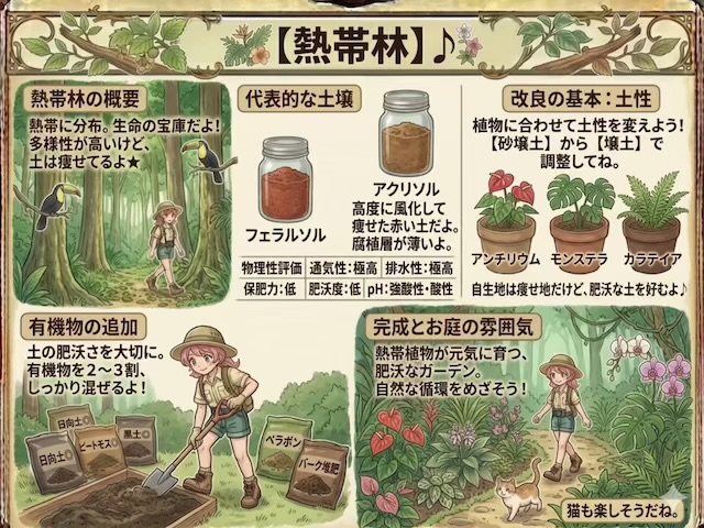 - 土壌:代表的な土壌は【フェラルソル(Ferralsol)】や【アクリソル(Acrisol)】です。土壌は高度に風化し、腐植層が薄く痩せており、鉄やアルミニウムが酸化することで土壌の色が赤色・赤褐色・黄色をしています。
