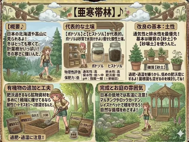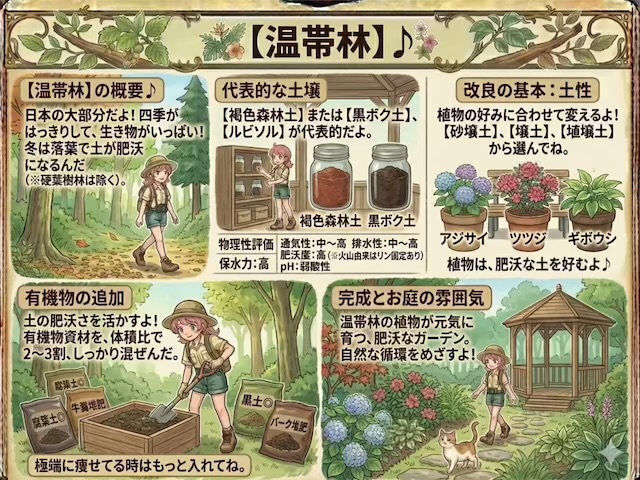 - 土壌:代表的な土壌は【褐色森林土】または【アンドソル・黒ボク土(Andosol)】や【ルビソル(Luvisol)】です。土壌は腐植層が厚く団粒構造が発達しており肥沃です。