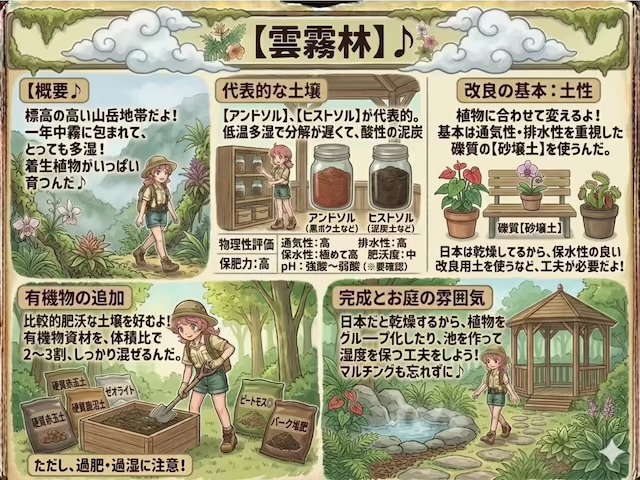 - 土壌:代表的な土壌は【アンドソル・(Andosols)】【ヒストソル(Histosol)】です。一般的な熱帯雨林と違い、標高が高い場所にあるため、低温と過湿により有機物の分解が停滞し、酸性の有機物層(泥炭状)が厚く堆積する傾向にあります。