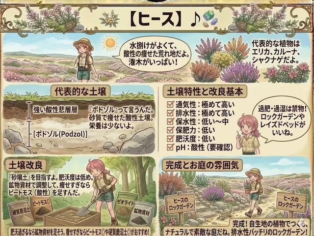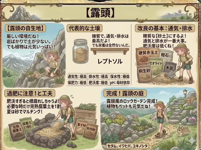 - 備考:有機物の分解が遅く、強い酸性のため、植物が利用できる養分に乏しい痩せた土です。栽培時に植物のためと思い肥沃にすると過肥・過湿を招き失敗する原因になりやすいです。また低地は高温になり根を傷めやすいため、マルチング資材(富士砂・矢作砂)で地表を覆うとよいでしょう。排水性を重視するためロックガーデンやレイズドベッドへの植え付けをおすすめします。