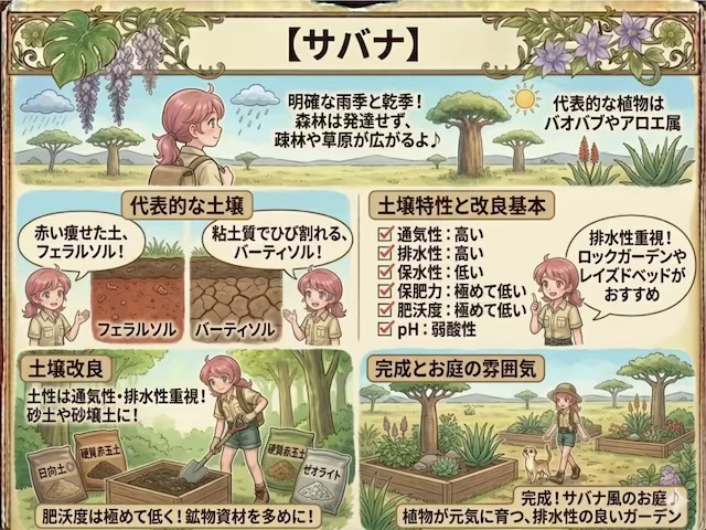 ここでは、これらバイオームと植生が見られる場所に焦点を当てて、その土地が持ってる特性(通気性・排水性・保水性・保肥力・肥沃度・pH)を分析し、日本の気候下での栽培における差異を考慮しながら、植物の生態に即した理想的な花壇作りの方法を紹介しています。花壇の土作りで迷ったときなどにご利用下さい❣️