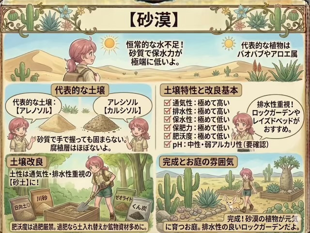 - 土壌:代表的な土壌は【レプトソル(Leptosol)】です。基本的に砂礫質で通気性・排水性が非常に高く、保水性・保肥力が低い土壌が大部分を占めます。動植物由来の遺骸(有機物)が少なく、低温でこれらを分解する微生物の働きも弱いため、腐植層は発達しません。ただし、未分解の有機物(泥炭など)が蓄積することがあります。